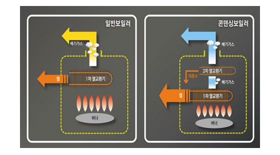 - 보일러 연소 시 발생한 배기가스의 버려지는 열을 2차 열교환기에서 재흡수하여 열효율이 높음