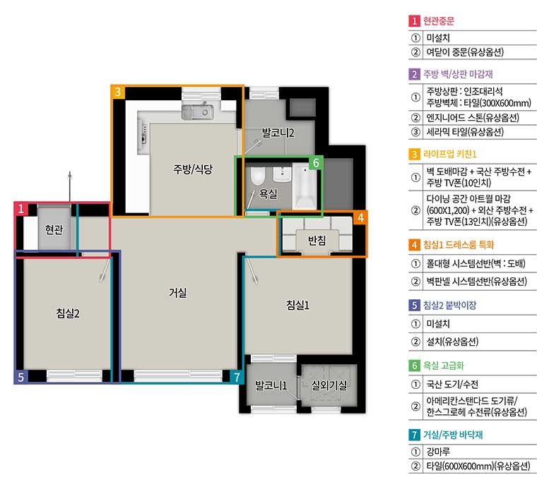 ※ 발코니 확장 및 옵션 선택에 따라 배선기구, 스마트 스위치, 조명기구, 세대분전반, 온도조절기 및 스위치 등의 종류, 수량, 위치는 변경될 수 있습니다.