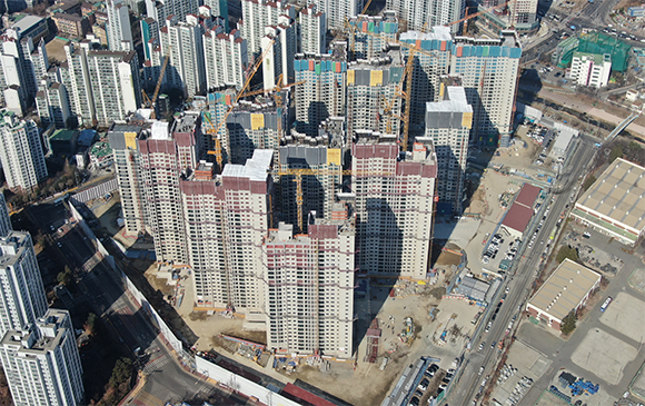 -. 내장공사 : 각동 1 ~10F 세대 바닥먹 및 단열재, 합지, 석고 시공