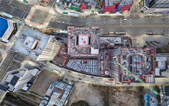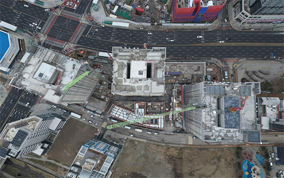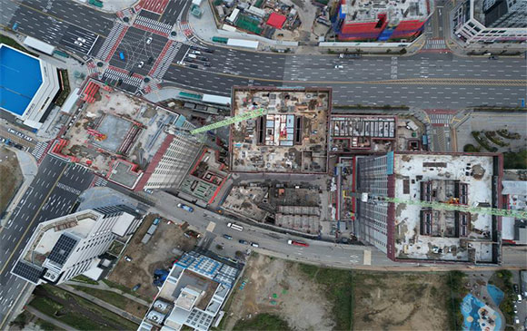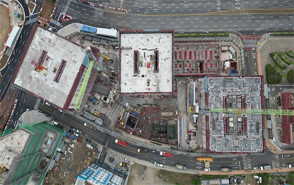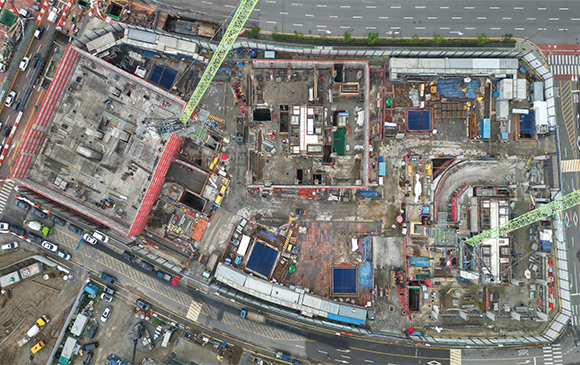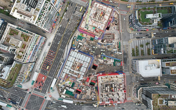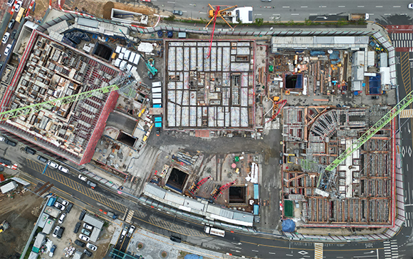 ① B2F Deck-plate 설치 ① B1F 역Raker 설치, 1F 메인 철골 설치