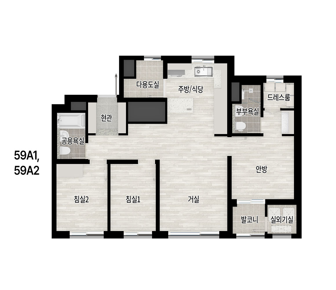 ※ 발코니 입면변화에 해당되는 타입(59A, 59B)의 경우, 단지별 전용면적은 동일하나 부위별 발코니 깊이에 따라 서비스면적이 다름에 따라 실사용면적이 상이하오니 이에 유의바랍니다.